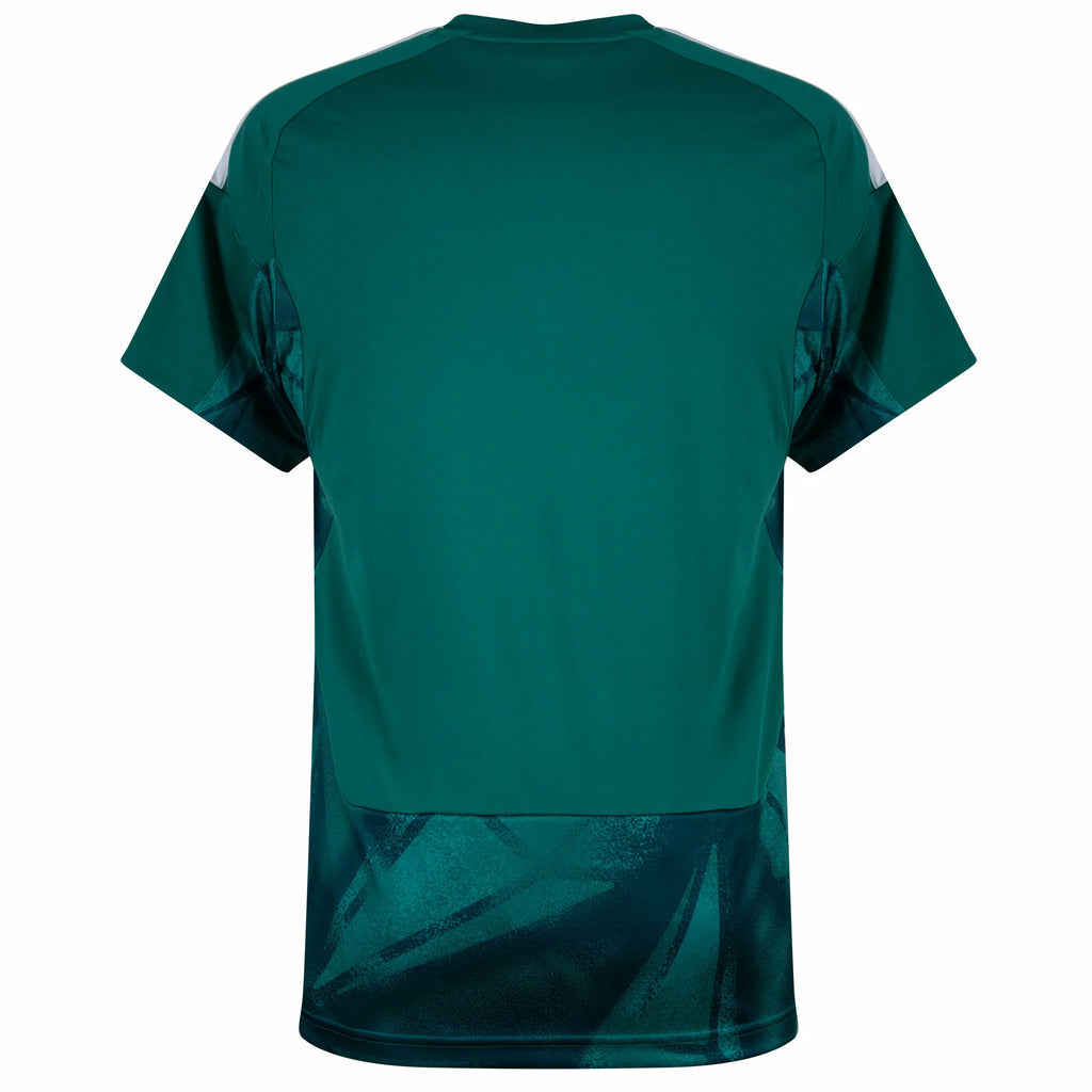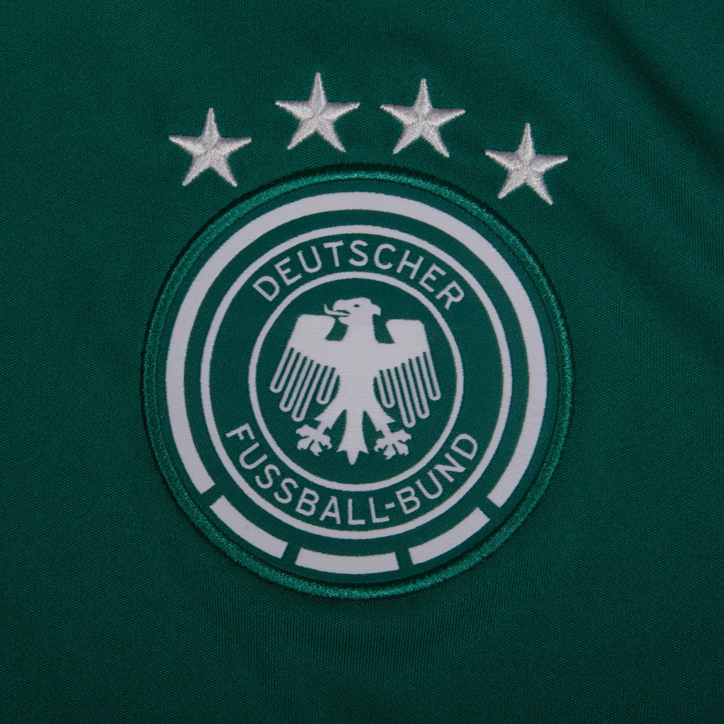Defenda seu território com a Camisa Alemanha Goleiro 2026-2027 em um vibrante tom de verde esmeralda. Esta peça Versão Torcedor combina um design gráfico moderno de estampa geométrica nas laterais com o conforto necessário para a prática esportiva ou uso casual. O tecido AEROREADY mantém o corpo seco durante o jogo, enquanto o brasão bordado da DFB reforça a tradição de grandes goleiros alemães. O modelo "Clean" destaca a cor sólida e os detalhes técnicos sem interferência de patrocínios.